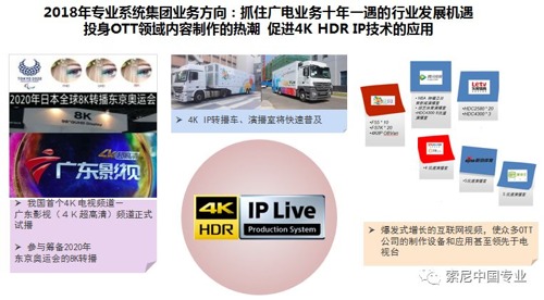 一方面,各大電視臺將加快以4K IP技術為核心的轉播車和演播室的普及,另一方面,阿里、騰訊及他們投資的中小型互聯網視頻公司對于轉播設備及索尼提供的小型化切換臺需求大增!斑@是廣電業務十年一遇的行業發展機遇 ,我們要抓住它,投身OTT領域內容制作的熱潮,促進4K HDR IP技術的應用!备邩虮硎。