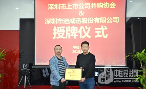 深圳市上市公司并購協會執行會長王海洋(左)為迪威迅董事長季剛(右)授牌