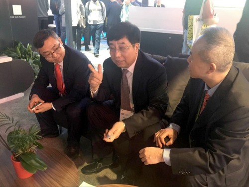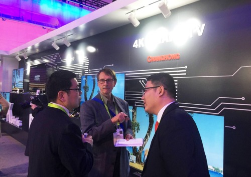 此外,3色4K激光影院的發布還吸引了海信集團周厚健董事長的關注,直接在長虹展區就與控股公司總經理李進和多媒體公司總經理滕光勝、激光公司總經理陳寧交流探討共同做大做強全球激光電視的經驗與思考。
