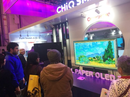 同時,超薄無背光的天然屬性+立體環繞音雙加持的長虹OLED屏幕自發聲技術也吸引了不少參觀者。