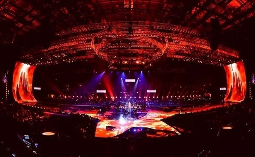 舞臺采用全景設計,打造多維度的舞臺空間,并“將整個演唱會放在一個‘圓’里”,同時運用虛擬現實、全息投影、AR現實增強技術、實時跟蹤等多種“黑科技”。按當前的舞美設計趨勢來看,這些技術也確實是大熱之勢,而我們也從中推測出大面積的LED地磚屏是跑不掉了。