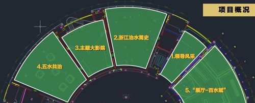 該展區主要播放浙江治水及有關生態環保的教育主題片、微電影等內容。為區別于傳統展館影院系統,該展區設計了六通道長弧形穹頂投影融合系統。