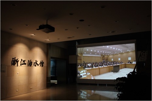 治水館入口處及安全通道交匯處設計了一塊7000×4400mm的裝飾卷簾,播放視頻記錄片,介紹歷屆浙江領導班子對治水工作的階段性政策及成果。