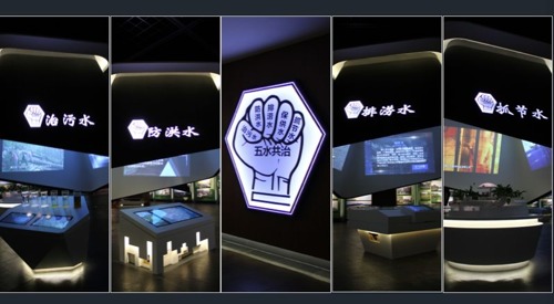 “五水共治”是指浙江治水工作的精髓,展廳中央設計了五個椎體罩及不同造型的展臺,結合展廳四周的圖文板,詳實的介紹了五水共治理念的產生及實踐過程。