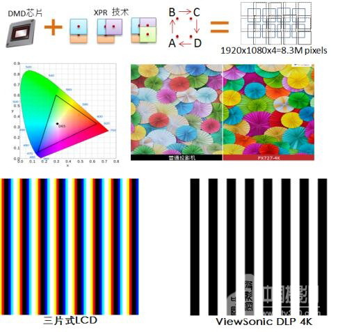 隨著4K的普及應用及家庭娛樂時代的到來,4K家庭影院投影機正成為影音用戶的優先選擇。優派PX727-4K采用TI 4K顯示芯片,符合美國消費者技術協會(CTA)對于4K超高清畫面的標準定義。4K UHD(3840X2160)分辨率可達四倍于Full HD的清晰度,XPR功能可顯示830萬像素,令畫面栩栩如生。12000:1對比度可提供更多的圖像細節,為用戶帶來4K真“視”界。此外,PX727-4K 配備2200lm亮度并支持HDR投影顯示功能,通過畫質處理引擎還原HDR信號中的亮色信息,自動調節區域間的亮度,提升畫面高亮與暗部細節表現,為用戶呈現明亮的白色及深邃的黑色,與普通HDTV的對比度及動態范圍相比,可帶來更好的亮暗對比并呈現更真實且鮮艷的投影畫面。三片式LCD投影在投射超高清影像時,由于液晶面板的光線疊加易在畫面邊緣產生疊影、溢色、損傷畫質及清晰度現象,優派PX727-4K投影機采用了獲奧斯卡獎的TI DLP DMD,可實現數字影院顯示功能,4K畫面清晰且色彩自然。