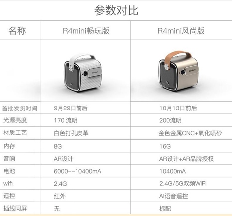 要知道,R4/R4s“手提式”設計成為如今眾多投影廠商爭相借鑒的形式,精致和優雅是它成功的基因。目前提供了金色和白色兩款顏色,其中金色相對高配,在10月中旬開始發售。
