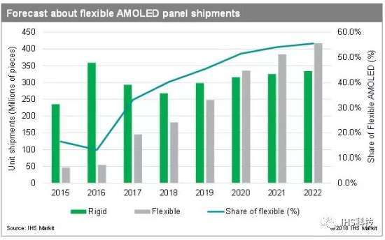 圖1:全球柔性AMOLED手機出貨量占比統計及預測(數據來源:IHS Markit)