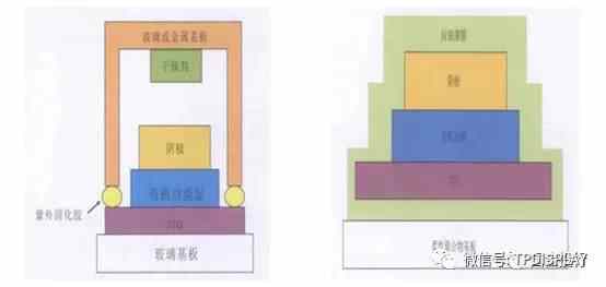 圖7:以玻璃為襯底和以玻璃或金屬蓋板封裝的OLED硬屏(左)與以柔性聚合物材料為基板和以單層或多層薄膜材料封裝的OLED柔屏(右)結構圖
