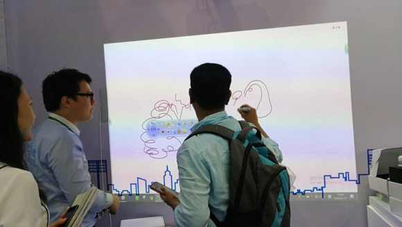 電子白板使用的艾博德超短焦激光投影機,投射100寸畫面時,機器離畫面的距離只需要6厘米,效果震撼;先進的圖像處理