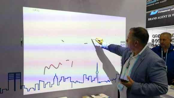 電子白板展區更是吸引了眾多客戶前來體驗,而它的原理是將小方盒接收器安裝在投影區域側邊中間位置,然后通過超聲波