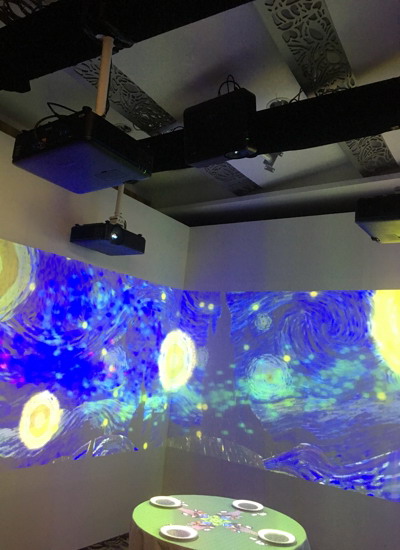 現(xiàn)場用一臺5000流明、全高清1080P的明基激光工程投影機LU950單臺投影到桌面,除了基本的餐具,絢麗的全息畫面完全倚賴上方的投影機,定制片源點對點投映餐桌及餐具,再利用3D投影映射技術(shù)和動作捕捉技術(shù),將餐桌布置成一場趣味表演秀的“舞臺”。
