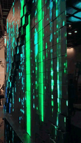 該項目采用的是艾比森D3V舞臺租賃產品。通常D3V產品的箱體結構是連接起來的,但是此次機械屏展示采用的是獨立的模組組成的裝置,需要重新設計排線,保證模組能夠來回自如地做伸出和縮回的運動。4塊屏,共1464塊模組,工程師們憑著多年創意屏的設計經驗,成功解決了這個難題。