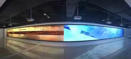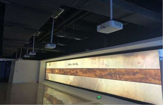 依托“詩畫開陽”的豐富旅游資源,為了讓參觀者全面了解開陽本地十里畫廊景區特色文化,展廳借助10臺NEC CF6700X(5800流明亮度、1024×768分辨率)高端商務液晶投影機做融合,在30米的高清軟膜幕布上投射瑰麗的超寬幅影像,整幅畫面可達10240×768的高分辨率。