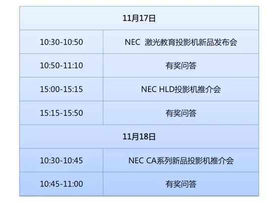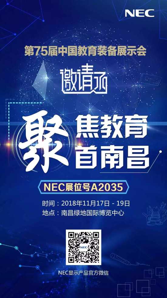 NEC顯示產品解決方案 第75屆中國教育裝備展示會將于11月17-19日在南昌舉辦。屆時,NEC將攜教育全線產品及應用方案首次亮相,并于展會發布全新激光教育投影機。您將現場領略NEC眾多高亮、高清、高色域教育機及方案的獨特魅力。展會期間,豐富活動等您來!