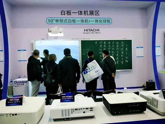 在現場展示中,東方中原(Donview)170寸電容白板一體機與兩臺日立激光光源反射短焦投影機完美搭配。東方中原代理的日立A9系列的激光超短焦投影機,分辨率高達500000:1,電動聚焦鏡頭的設計,令使用及調試更為簡便,并且同比業內率先推出了5G高速無線信號傳輸,無線演示更流暢,平均無故障運行時間達到了8萬小時。二者的完美組合,將給教學演示帶來更加強烈的視覺沖擊感。