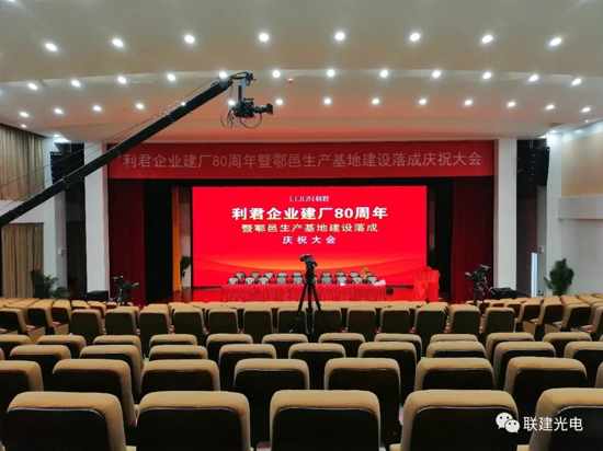 為共慶企業華誕,向社會各界展示利君制藥積極向上的企業風貌,利君企業高度重視本次慶祝大會,從會議流程到節目選調、從節目彩排到場地布局,都嚴謹認真的籌備著。值得一提的是,此次慶典在利君企業新落成的暨鄠邑生產基地大禮堂舉辦,禮堂面積達上千平米,而在舞臺正中央,由聯建光電傾情打造的高清LED顯示屏尤其引人注目,大屏面積約80㎡,宛如巨幅的畫卷平鋪在舞臺中央,是本次慶祝大會的背景大屏,承擔著傳達信息與烘托現場氣氛的作用,至關重要。