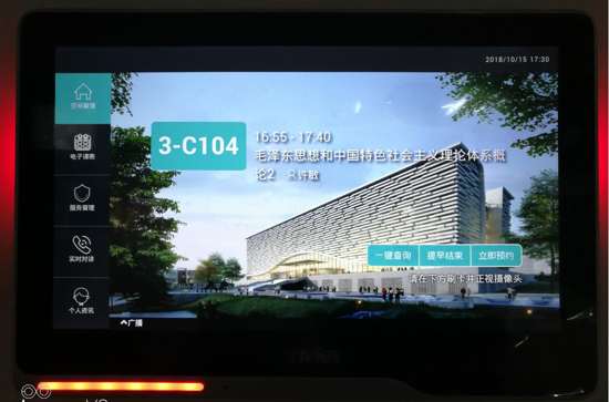 該校共部署智慧班牌58臺,該智慧班牌可實現智慧班牌管理終端,學校一卡通系統、教務排課系統等實時對接,通過校園網,實現空間的智慧化管理應用;老師和學生可以在終端、APP上快速查找自習室等自己所需要的教學空間;空間使用統計分析;考勤統計分析;手動實現考務場景;教學服務保障體系診斷;空間查詢;空間預約;“小”班牌擁有“大”智慧。