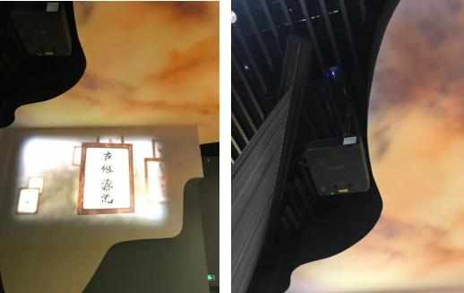 “平陽千秋”展項呼應(yīng)臨汾當(dāng)?shù)貍鹘y(tǒng)戲劇,為讓展覽內(nèi)容融于周圍環(huán)境,畫面下高度離地面約1.5m,顯示畫面邊緣柔化,與天花板圖景融為一體,交相輝映。而能夠達(dá)成這樣的設(shè)計,與明基激光工程投影機(jī)鏡頭豐富靈活的特點有密切關(guān)系,明基工程投影機(jī)可以配置投射比不同的諸多鏡頭,不懼空間大小,靈活安裝應(yīng)用。