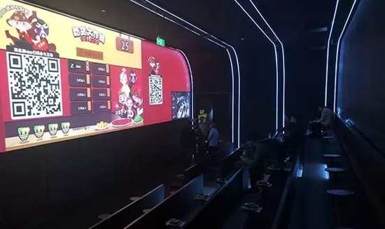 智慧餐廳入口的右手邊就是海底撈聲稱的全球頂配版等位區,就像我們熟悉的劇院造型,屏幕的位置就是13*3m的矩形投影屏,可以展示3d動畫等各式影片。