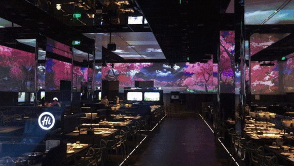 繼續往前走就是就餐區了。360°全屋環繞式立體投影,5塊超大穹頂屏幕,6大場景主題(星空、桃園仙境、雪山、油畫、治愈系)……為顧客呈上一場視覺、味覺、嗅覺、聽覺的全感式火鍋盛宴,整個場景的創意團隊包括央視導演等專業人士。