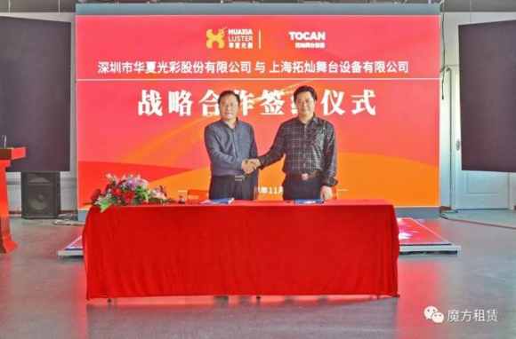 11月29日下午,深圳市 華夏光彩股份有限公司與上海拓燦舞臺設備有限公司舉行戰略合作簽約儀式 ,此次簽約分別由華夏光彩租賃事業部鄧利明鄧總和上海拓燦舞臺設備高福啟高總進行簽約,此次簽約將分別結合雙方的生產優勢、團隊優勢和渠道優勢,為LED租賃客戶提供快捷和即時的專業服務,一起為華夏光彩租賃事業助力發聲。