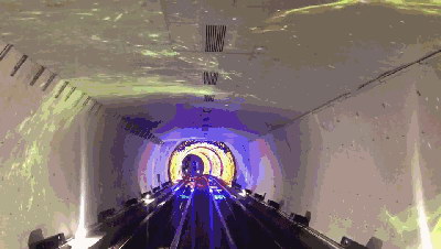 在“時光隧道”主題區域,隧道壁上破裂的鋁板、列車撞擊地面的巨響,表明游客已經鉆入地層,進入到了“地底世界”。在“漩渦區”,光波飛速倒退,光纖閃亮,化作一個絢麗的漩渦。