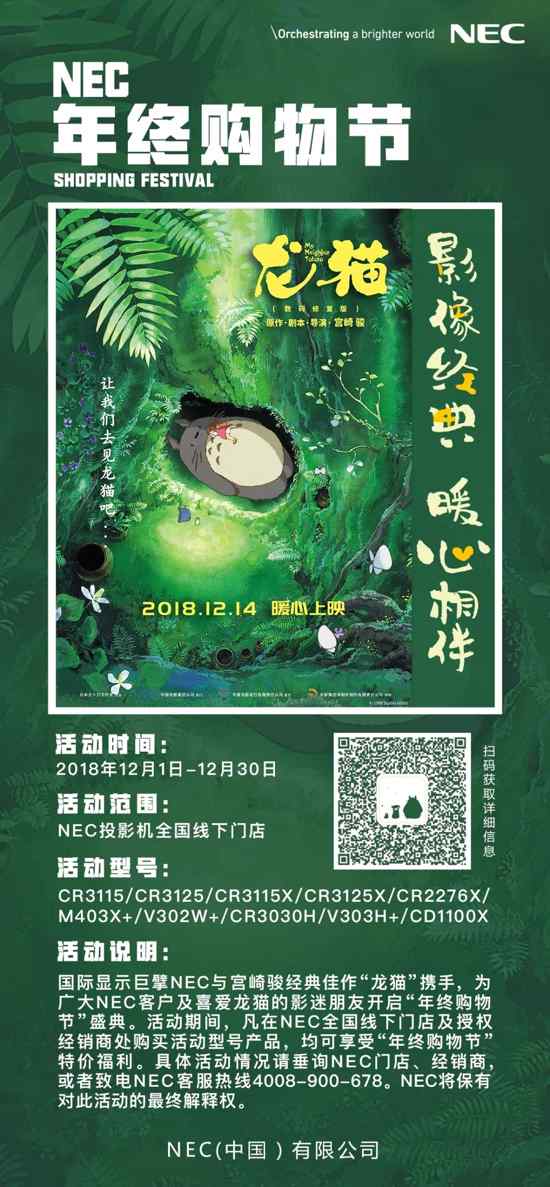 30年仿佛彈指一揮間,從難得一見的膠片電影、標清影像到數字高清電影的全面普及;從第一臺笨重昂貴的CRT投影機,到現在高清家庭影院走入尋常百姓家。作為投影機業界泰斗,NEC與全球廣大用戶共同見證了40年影像技術的不斷進步與革新,始終致力為用戶帶來更優質的觀影體驗不斷努力精進。12月14日,在經典電影《龍貓》上映之際,NEC與電影《龍貓》攜手舉辦的“NEC年終購物節”正在如火如荼的進行,關注活動海報了解更多活動信息,掃碼海報二維碼參加公眾號活動,還有更多驚喜等你拿!