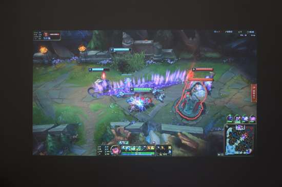 再用HDMI線連接主機,體驗100英寸大屏游戲。將游戲投放到大屏上,確實是一般顯示器無法比擬的,視覺沖擊力更強,對于游戲的操作也更精準。整個畫面清晰自然,色彩還原高,投放時沒有延遲,團戰時使用大招效果明顯比顯示器出色,玩游戲也會更有激情。