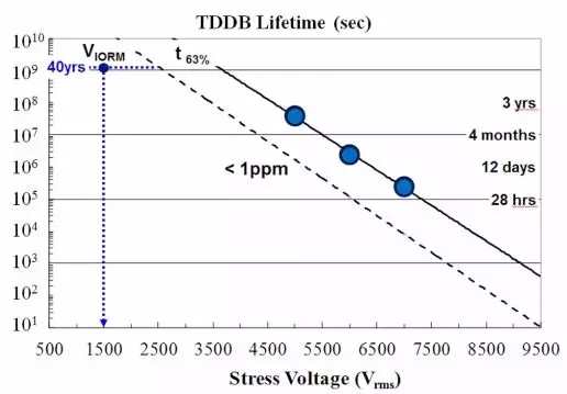 主要的隔離電氣壽命測試是時間依賴型電介質擊穿測試,簡稱TDDB。TDDB是用于確定作為電壓的函數的電介質壽命的標準方法。在下圖中,您可以看到,用于測試的電壓為藍點,這些電壓為5,000、6,000和7,000VRMS,遠高于1,500VRMS的工作電壓。