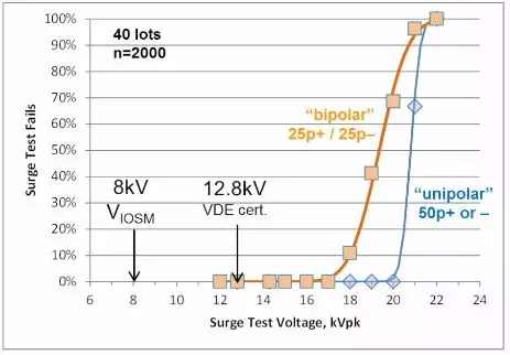 該圖表明,浪涌測試失敗率是電壓的函數。我們所使用的方式是,在不同的電壓下測試一定數量的器件,記錄失敗的數量。此測試使用了具有相同極性的50個脈沖。我們將其稱為單極性浪涌測試。我們使用50個正脈沖,或者50個負脈沖進行測試。單極性測試代表對單一浪涌事件的抵抗力。但是,還有另外一種測試方法,我們稱之為雙極性測試。雙極性測試是由于磁滯效果造成的最壞情況浪涌測試。在此測試中,每個器件都要先后承受具有相反極性的25個脈沖。當我們切換極性時,器件中仍具有前25個脈沖所造成的部分電荷,這會給隔離層帶來更大的壓力。這種測試代表對更加復雜的浪涌事件的抵抗力。