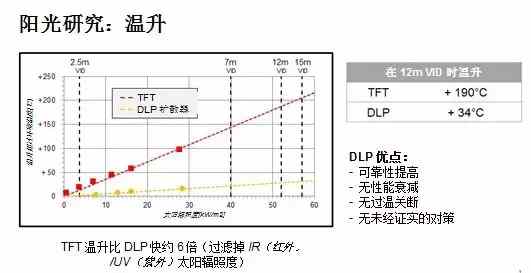 在85°C的環(huán)境溫度下,由于其低光譜吸收和高工作溫度的特性,HUD系統(tǒng)中采用DLP技術(shù)的Kuraray散射屏可以承受高達82kW/m2的太陽輻照度。這種熱性能使DLP技術(shù)能夠支持AR HUD中的長虛像距離。