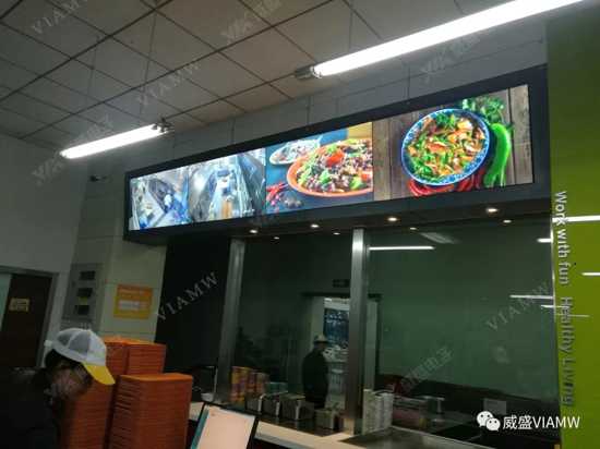 該項目主要分三個顯示區域,一樓位置共有1*19個顯示終端,二樓位置共有1*12個顯示終端,另外一個區域為1*8的顯示終端。整個項目共有41個DC4000解碼盒連接每一塊顯示屏,僅用一臺多屏媒體服務器控制,使用VIA威極分分布式系統架構實現顯示系統的播放,屏幕顯示食堂的食譜,菜單等。同時還可以分屏顯示廚房監控的畫面,讓消費者可直觀看到廚房菜品的切配烹飪、餐飲具消毒等。