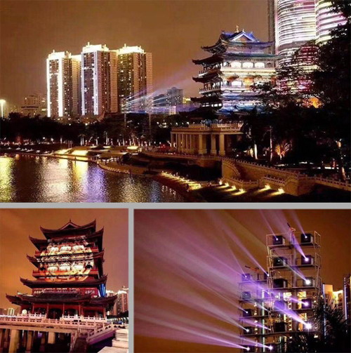 暢游閣投影秀是由DP團隊設計、安裝、調試整體總包的項目。在只有20天的短時間內內完成40臺MV18K+22臺EV6500的高空安裝調試,非常具有挑戰性。戶外投影非常考驗投影機性能,在結構復雜的超大面積建筑表面,要想獲得出色的畫面效果,需要超高亮度和卓越畫質。此外,戶外溫差變化、天氣狀況對投影機的穩定性耐久性要求也更高。