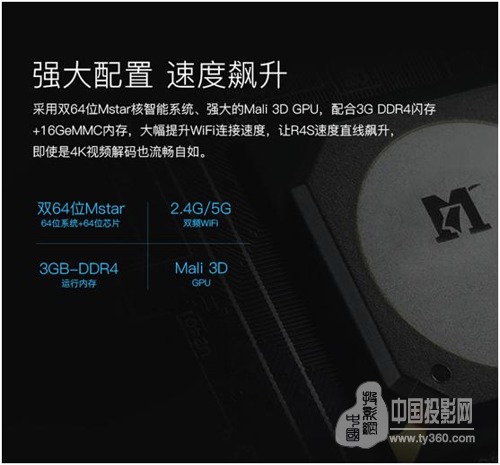配置上,酷樂視R4S采用全新64位MSTAR核智能系統(tǒng)和Mali3D GPU的視頻處理器,支持3D/4K,搭載3GB的DDR4RAM,在同等內(nèi)核頻率下速度是DDR3的兩倍, 16GeMMC的存儲相比同類4G、8G的存儲性能更強,支持上下左右四向梯形校正、1.2投射比、光學調(diào)焦、自動聚焦、無線同屏以及HDMI、USB等常用接口。