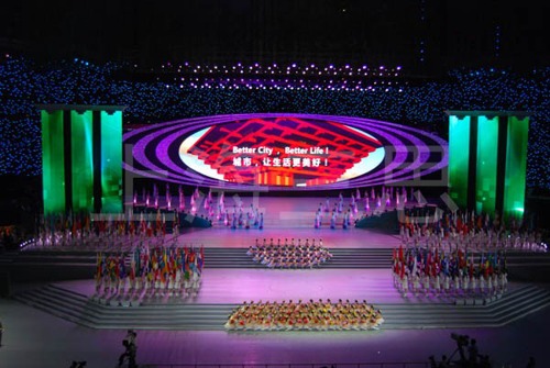 除了春晚,2010年的世博會開幕式上也使用了當時較為先進的舞臺背景全彩LED顯示屏。該塊LED顯示屏由上海三思制造,顯示面積達500㎡,總像素達1300萬,采用了多畫面實時同步播放控制、實時無縫切換數據環路、逐點亮度色度一致性校正和低亮度下無灰度損失等控制技術,使得高科技與原生態在舞臺上獲得了完美的交融。恢弘大氣的屏幕配以優美多變的舞姿,讓開幕式煥發朝氣蓬勃的嶄新面貌,顯示出中國文化自信的另一面:包容、接納、歡樂、分享。