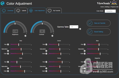 優派PX705HD及PX725HD配備的vColorTuner顏色配置工具,能幫助追求色彩還原度的用戶在不同情境下設置喜歡的個性化色彩模式。用戶可使用Mini USB連接投影機與電腦,在優派官網下載并注冊vColorTuner軟件,進行顏色參數更換,也可通過網絡論壇等渠道獲取其他愛好者分享的色彩設定文檔導入至用戶投影機中,從而帶來多樣化家庭影院色彩體驗。優派為用戶配備了五種色彩模式(高亮模式、運動模式、標準模式、游戲模式及電影模式),用戶可通過vColorTuner軟件界面對投影機的五種色彩模式進行調節和參數設置,方便其根據投影環境選取適合觀賞的色彩模式。此外,vColorTuner軟件支持在線更新功能,用戶可于電腦上運行工具程序,同樣通過使用Mini USB 與投影機進行連接完成升級工作。