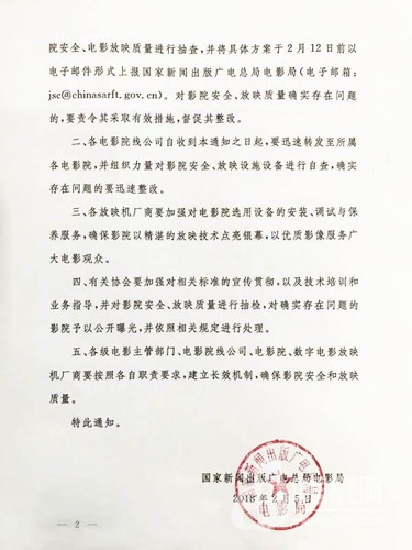 保障電影安全優(yōu)質(zhì)放映、提高電影放映質(zhì)量,是每個電影從業(yè)者義不容辭的責任和義務。影院如果忽視放映質(zhì)量,不僅影響觀眾觀影體驗,更會對影院造成損失。尤其春節(jié)期間影院客流加大,設備工作時間延長,放映頻次增多,容易引發(fā)安全事故。因此通知的下發(fā),給電影行業(yè)敲響了警鐘。通知指出,各放映機廠商要加強對電影院選用設備的安裝、調(diào)試與保養(yǎng)服務,確保影院以精湛的放映技術點亮銀幕,以優(yōu)質(zhì)影像服務廣大電影觀眾。