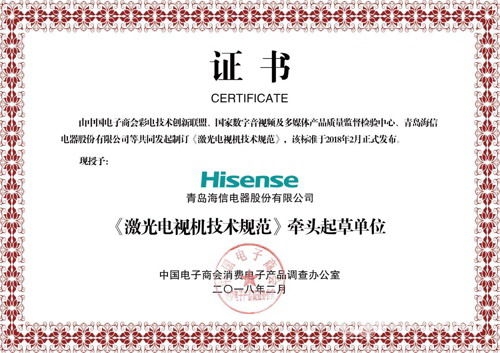 2月28日,在“激光電視標準發布暨激光顯示聯盟成立”發布會上,由海信與中國電子技術標準化研究院、中國電子商會聯合起草的《激光電視機技術規范》正式發布,這是中國彩電行業第一個激光電視產品標準。從此,中國激光電視行業將正式步入規范、健康和有法可依的快車道。
