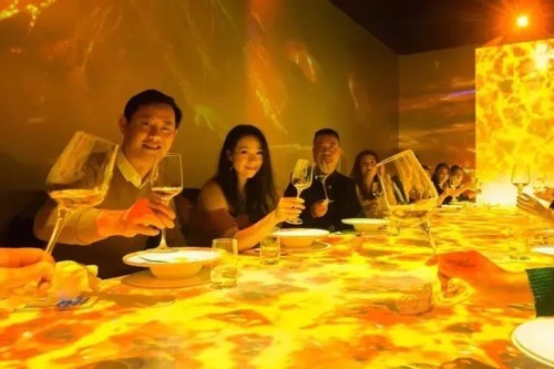 每一道菜肴擺上餐桌時,空間中360°影像隨之變幻,為饕客創(chuàng)造了一個互動感、儀式感、體驗(yàn)感“三感”完美交互的場景。日立工程投影機(jī)創(chuàng)造大畫面影像,隨著菜式變化,環(huán)境主題也隨之轉(zhuǎn)換,再加上空氣中散發(fā)著香料味道,饕客仿佛身臨“超時空派對”,在冰山雪地、沙灘海洋、火山草坪穿梭。