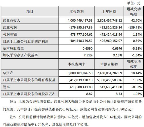 報告期內(nèi)公司實現(xiàn)營業(yè)總收入4,000,449,497.53元,同比增長42.70%;實現(xiàn)營業(yè)利潤-179,595,657.39元,同比減少139.71%;利潤總額478,777,104.62元,比上年同期增長1.34%;實現(xiàn)歸屬于上市公司股東的凈利潤403,275,444.28元,比上年同期增長0.60%。報告期內(nèi)公司基本每股收益為0.6590元,比上年同期減少5.52%。現(xiàn)對上述相關(guān)財務(wù)指標的變動說明如下: