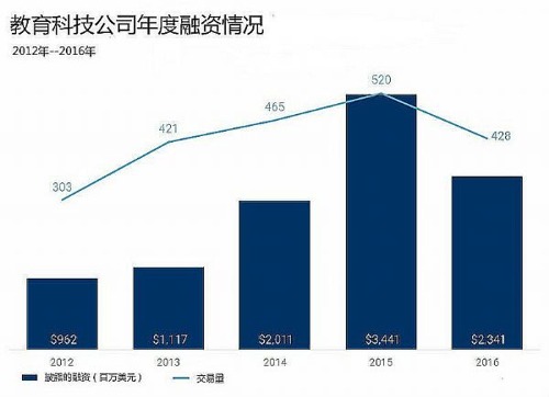 2012至2015年,教育科技創(chuàng)業(yè)公司所獲投資額每年都有增長(zhǎng)。在此時(shí)期內(nèi),同行業(yè)所獲的美元投資漲幅超過250%,交易數(shù)量漲幅也達(dá)72%之高。然而,2016年美元投資和交易數(shù)量卻有下降,較2015年分別下挫約32%和18%。