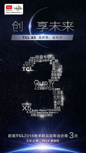 TCL春季新品發(fā)布會將在3月6日在上海隆重舉行,TCL 旗下的QLED X/C/P三系列新品將會全線震撼發(fā)布,屆時會給大家?guī)碓鯓拥捏@喜呢?從流出的宣傳畫來看,本次發(fā)布會的主題是“創(chuàng)享未來”,更是不由讓人遐想連篇。