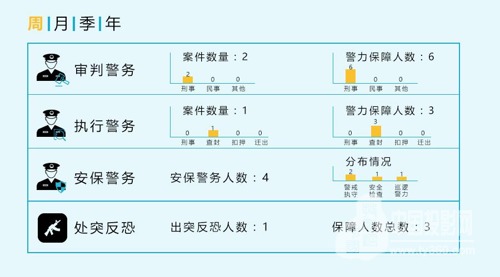 平臺還錄入了法警的詳細信息,包括執法資格等級、體能訓練、授銜記錄以及獎勵情況等,實現對法警人員信息的統一管理。領導可以通過平臺直接了解法警的隊伍建設情況,更有利于法警隊伍的優化建設。