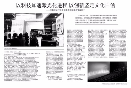 都說科技是國之利器,其實也是電影行業的利器,中影光峰運用先進的科技手段,為中國電影產業打開一扇新的大門。兩會伊始,當電影產業毫無疑問再次成為大家熱議的話題時,作為國內ALPD®激光放映技術的先驅,3月5日,中華工商時報在兩會會刊上對中影光峰進行了一次深度報道,高度肯定中影光峰憑借科技創新對中國電影產業發展帶來的推動,并成為中國向電影強國邁進道路上的有勁基石。