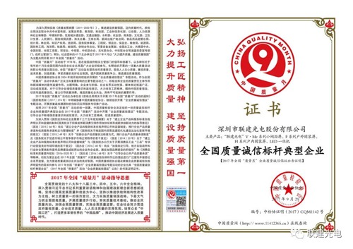 堅(jiān)持對(duì)品質(zhì)的執(zhí)著可謂是聯(lián)建光電成長(zhǎng)為L(zhǎng)ED顯示知名品牌的關(guān)鍵,公司自成立以來(lái),始終堅(jiān)持“質(zhì)量是企業(yè)生命”的至臻信條,嚴(yán)格執(zhí)行ISO9001:2000質(zhì)量管理體系,建立了獨(dú)有的設(shè)計(jì)、生產(chǎn)、安裝到服務(wù)全過(guò)程的質(zhì)量控制和管理體系,打造了包括產(chǎn)品評(píng)審制度、原材料進(jìn)廠檢驗(yàn)制度、制程檢驗(yàn)制度、出廠檢驗(yàn)制度、產(chǎn)品追溯及服務(wù)制度等在內(nèi)的上百道工序和檢測(cè),以極為嚴(yán)苛的品質(zhì)管理體系鑄造軍品級(jí)的LED顯示屏品質(zhì)。正是這份堅(jiān)持,讓聯(lián)建光電得到了市場(chǎng)的認(rèn)可,歷年來(lái)斬獲多項(xiàng)殊榮,包括“深圳市知名品牌”、“廣東省守合同重信用”,于2017年獲得中國(guó)質(zhì)量檢驗(yàn)協(xié)會(huì)頒發(fā)的“全國(guó)LED顯示屏行業(yè)質(zhì)量領(lǐng)先品牌”、“全國(guó)質(zhì)量誠(chéng)信標(biāo)桿典型企業(yè)”、“全國(guó)質(zhì)量檢驗(yàn)合格產(chǎn)品”及2018年“全國(guó)產(chǎn)品和服務(wù)質(zhì)量誠(chéng)信示范企業(yè)”、“全國(guó)質(zhì)量信用先進(jìn)企業(yè)”稱號(hào)以及其他獎(jiǎng)項(xiàng)殊榮;公司先后獲得安全生產(chǎn)許可證、鋼結(jié)構(gòu)施工資質(zhì)、系統(tǒng)集成資質(zhì)并通過(guò)國(guó)軍標(biāo)質(zhì)量管理體系認(rèn)證。這些榮譽(yù)既是對(duì)聯(lián)建光電的肯定,也是對(duì)未來(lái)聯(lián)建光電追求更高品質(zhì)的鞭策與激勵(lì)。