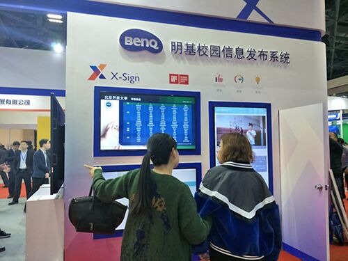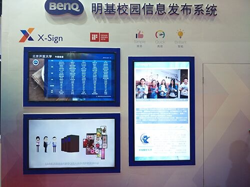 從展會現場的明基展位可以看到,顯示大屏上不斷播放來自北京各大高校的校園文化風采,視頻、靜態圖交替滾動,吸引了一些參展高校的采購者駐足,一位北京理工大學的老師覺得,“采用電子屏呈現校園風采是有必要的,對外展示校園魅力,對內拉近與學生的距離,而且比現有的普通宣告欄高效得多。”