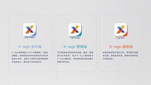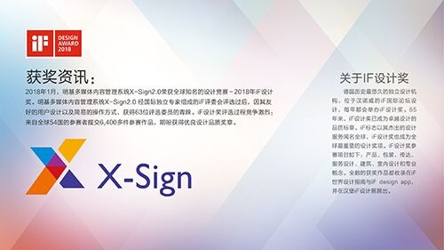 X-Sign2.0軟件系統分為管理端、設計端和播放端,管理端集中控制分散在各區域的顯示屏,并且能夠開設不同權限級別的賬號;而設計端擁有數百套特別定制的精美顯示模板,無需設計基礎就能上手操作,做出心中美觀大方的顯示內容;終端的播放設備支持無網絡狀態的USB播放,解決網絡不穩定帶來的罷工情況。而且在2018年1月份, X-Sign2.0憑借友好的用戶設計以及簡易的操作方式,榮獲全球知名的設計界“奧斯卡”獎項——2018年iF設計獎。
