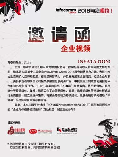 5)臺詞參考:臺詞參考:各位中國投影網的網友們大家好,我是××(公司)的××,XX展會即將開幕,借此之際,×××(公司名稱)借中國投影網平臺邀請您蒞臨我們的展位,展位號×××,本次展會帶來了……期待與你不見不散……最后預祝本屆展會取得圓滿成功,(可自由發揮)