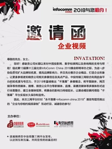 5.視頻臺(tái)詞內(nèi)容:×××(公司名稱)借2018北京IFC展之際祝視聽行業(yè)(投影、音響、數(shù)字標(biāo)牌)+自由發(fā)揮內(nèi)容(參考:本次XXX在XXX展位,屆時(shí)將展出XXX等主要產(chǎn)品+歡迎大家蒞臨XXX展位觀展);