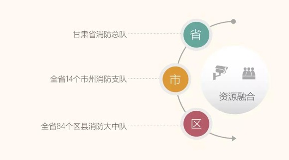甘肅省消防總隊指揮中心可視指揮調度系統,依托專用 IP網絡,接入各區域現有視頻會議系統、監控系統等,覆蓋全省14個市州、84個區縣的消防支隊及大中隊,實現三級聯通。同時,全省消防數據實現共享共建,為系統提供了豐富詳實的消防資源數據庫,形成“縱向貫通、橫向互聯、資源共享”的消防體系,做到突發情況全網響應,協同作戰。